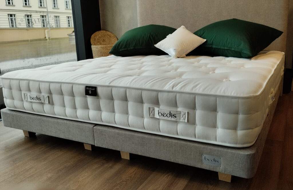 Na uvedenej vystavenej posteli je výška nožičiek 10 cm (možnosť zmeniť) a je vyhotovená v látke Forest 120 light grey. Cena je uvedená s  matracom Bedis . Na predajni je vystavená posteľ s matracom Bedis Medium